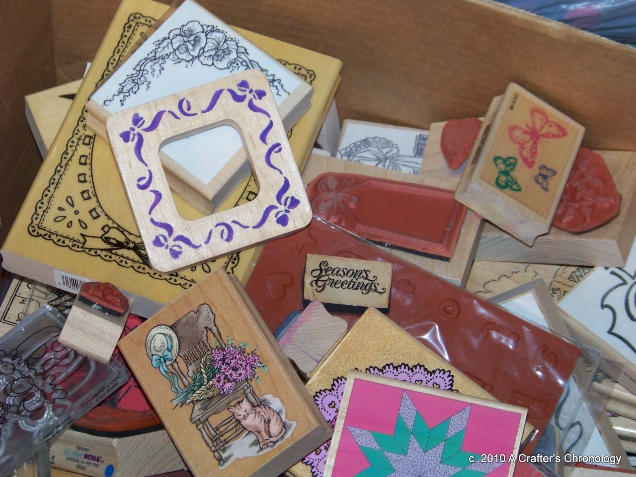 Today's accomplishments included plugging in my pencil sharpener, taking a pile of unfinished sewing projects to the basement for temporary storage (Sarah is limiting me to one basket of projects in the craft room at a time), and going through every single rubber stamp that I own, which seemed like thousands.   We filled a copy paper box 3/4 full of stamps to get rid of, although whether we will try to sell them or give them away hasn't been decided.